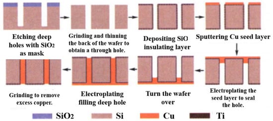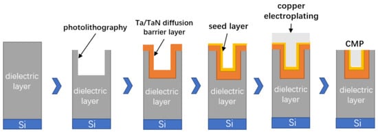 Cu is generally used as the internal metal interconnection material of TSV vias in the manufacturing process of TSV. However, the application of copper in the interconnection lines faces some challenges. The diffusion speed of copper in the silicon dioxide medium is very fast, which easily leads to the serious degradation of the dielectric properties of the insulating layer and even leads to the deterioration of the device at low temperatures. Therefore, before electroplating Cu to fill the TSV vias, the barrier layer can be prepared to prevent copper from migrating to the silicon substrate, so that copper can be used in integrated circuits. Usually, cobalt, silicon tantalum nitride, titanium, titanium nitride, silicon nitride and tungsten nitride are used as barrier layers. Among them, titanium (Ti) is used as a seed layer and barrier layer because of its low resistivity and high thermal stability. Titanium is considered an excellent barrier material that can prevent copper from infiltrating at an annealing temperature of 400 °C and provides good adhesion between the copper and dielectric [31]. For the manufacture of high aspect ratio vias, it is difficult for ordinary deposition methods to deposit continuous copper on the sidewalls of the TSV. Ion Magnetron sputtering (IMP) or metal–organic chemical vapor deposition (MOCVD) methods are usually used to generate barrier layers and seed layers [32]. Figure 8 depicts the circulation of copper during the process of via hole technology procedure. Copper is deposited from the dielectric layer on the silicon wafer, and the dielectric film is patterned by photolithography. Then a thin film of Ta/TaN diffusion barrier layer is deposited on top of the dielectric pattern by PVD or CVD. It is typically necessary to deposit a copper seed layer beforehand for copper electroplating due to the low conductivity and poor nucleation behavior of Cu on the Ta/TaN layer, as well as the poor ductility of these barrier materials in previous studies [33].