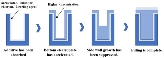 At present, the main metal materials filled with the central conductor of the silicon through hole are copper and tungsten. Because of its excellent conductivity, copper can be well integrated with the current process, and electroplating is generally used to fill copper [34]. Tungsten is also one of the most commonly used filling materials as a conductive material for TSV and is also very compatible with the current process. Tungsten has unique advantages that copper does not have. On the one hand, tungsten is a non-diffusion metal, and there is no need to deposit a barrier layer/seed layer, which reduces the manufacturing cost of TSV and shortens the manufacturing process. On the other hand, because the thermal expansion coefficient of metal tungsten is small, the gap with other materials is small. Hence, the thermal–mechanical stress of tungsten–silicon vias of the same size is much smaller than that of copper–silicon vias. Of course, tungsten also has some disadvantages, such as a higher resistivity than copper, which makes tungsten TSV not suitable for high-power signal transmission lines and power/ground wires. In addition, aluminum and other metals are used as conductor-filling materials. To sum up, which material to choose for filling depends on the purpose of the manufactured silicon via [35]. At present, the copper sulfate process system is mainly used for filling copper in TSV electroplating. Six elements make up the majority of the electroplating solution: sulfuric acid, copper ions, chloride ions, accelerators, inhibitors, and levelers. As shown in Figure 9, the ideal filling process is a bottom-up deposition process, which requires a reasonable proportion of different additives, such as inhibitors and accelerators, in the copper plating solution. This process can achieve the effect of “accelerating in the hole and inhibiting the hole”; this results in a silicon through hole structure with low resistivity, no cavity and high reliability [36].