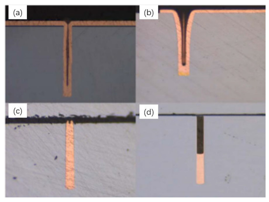In the process of electroplating copper filling, defects such as voids or cavities will lead to serious reliability problems, so it is very important to optimize the process of electroplating filling to achieve a good filling effect for functional reliability. Based on this, Daowei Wu [10] suggested that the electroplating should adopt a segmented current mode to increase the jitter setting. The process parameters of segmented electroplating obtained from the test are shown in Table 1, and the best effect was obtained when the jitter frequency was 20 Hz. Figure 22 shows the effect diagram after electroplating filling with the parameters in Table 1.