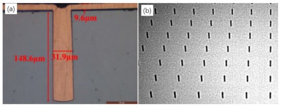 SEM morphology of the 30 µm hole. (a) Cross-section of the TSV hole prepared by the Bosch process; (b) local detail of the TSV hole (Reprinted with permission from Ref. [10], 2021, Wu, D.-W.).