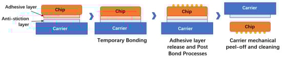 TBDB is one key technology in enabling the 2.5D/3D integration of semiconductor devices [41]. Temporary bonding/debonding (TBDB) technology has been put forward in the semiconductor industry to avoid fragmentation after wafer thinning. In this technology, the wafer is temporarily bonded to a hard slide to provide sufficient mechanical support. After the processing and interconnection are completed, the TSV silicon transfer substrate is peeled off from the temporary slide without loss [42]. The process flow of the TBDB is shown in Figure 14.