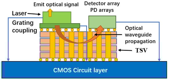TSV is very important for applications such as complementary metal oxide semiconductor (CMOS) image sensors (CIS), high bandwidth memory (HBMS) and switchboards. Because the surface of the CIS chip is photosensitive, the electrical signal of the CIS chip must be output from the back; TSV now serves as the fundamental CIS chip electrical connection structure. Three-dimensional integration technology based on TSV technology, which is engaged in by the Massachusetts Institute of Technology and Eindhoven University of Technology in the Netherlands, is the best way to realize a photoelectric integrated micro-system. Figure 16 shows a schematic diagram of a photoelectric micro-system [48].