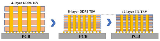 At present, TSV technology is the preferred connection method for high-end storage. The most successful manufacturer is Samsung. Samsung unveiled the first 64 GB DDR4 memory module in the world with TSV 3D packaging technology. To increase capacity and performance, DDR4 employs Samsung’s cutting-edge 20 nm and 3D TSV via-middle packaging technology, which connects the chips or silicon wafers vertically [49]. At the HotChips 33 (2021) Conference, Samsung introduced the DDR5 memory with an eight-layer TSV package that they are developing. Compared with the four-layer TSV carried by DDR4 of Samsung Electronics, its memory capacity will be twice that of DDR4, and a single DDR5 with 512 GB will be realized in the future. Through package optimization, Samsung decreased the chip pitch by 40% and employed thin wafer technology, resulting in a DDR5 height of an eight-layer TSV package that was lower than that of a four-layer DDR4 package and had better heat dissipation capacity [50]. In addition, Samsung Electronics has successfully developed a new process for packaging twelve-layer 3D TSV chips. This is the first process in the industry to use a twelve-layer TSV 3D package, compared with only eight layers before. The shell thickness of the new twelve-layer 3D TSV chip is 720 μm, which is equivalent to the current eight-layer HBM2. Maintaining the same thickness allows customers to use new twelve-layer packaging products without changing the existing design, which means that products with a larger capacity can be directly used. As shown in Figure 17, HBM is a memory chip based on a multilayer stack. Today, HBM can produce twelve-layer stacks, and it is estimated that it will produce more than sixteen-layer stacks in the near future. Of course, if there is no TSV connection, this is impossible [51].