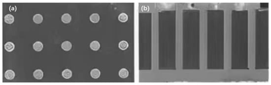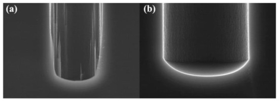 Comparison diagram of micro grass at the bottom of the TSV hole before and after optimization; (a) there are micro sketches after etching; (b) no micro-sketch after etching (Reprinted with permission from Ref. [10], 2021, Wu, D.-W.).