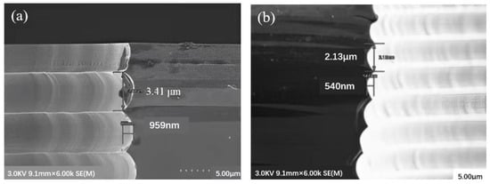 The local active etching groups in the hole eventually become fatigued as the depth–width ratio rises throughout the etching process. This causes a number of secondary issues to arise, including reactive-ion etching (RIE) lag, nicking, micro-grass, etching halt and loss of critical dimension (CD) control. In order to optimize the etching sidewall morphology, Daowei Wu [10] proposed a preparation method of a photoresist AZ6130/SiO2 composite structure mask, and the optimal selection ratio of a composite mask as 2.3. On this basis, the etching process parameters of the TSV holes are optimized. By comprehensively shortening the etching time, prolonging the passivation time and increasing the bias power to 90~120 W, the problem of micro-grass at the bottom is successfully solved, as shown in the SEM images before and after optimization in Figure 18.