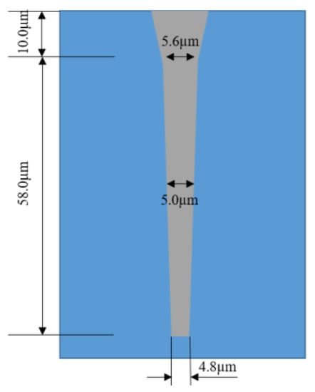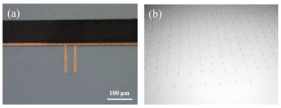 Park et al. [53] optimized the RIE conditions of 100 W RF power and 30 SCCM (standard cubic centimeter/minute) for 30 min, which reduced the average depth of the scallops from 230 nm to 20 nm, resulting in a smooth profile of the sidewall groove. Frasca et al. [54] reported that using 40% potassium hydroxide at 60 °C to form a Michelangelo step can prevent the formation of scallops, and conformal copper filling can control the critical aspect ratio phenomenon in DRIE by a micro-loading effect and RIE hysteresis. Gerlt et al. [55] realized the reduction of RIE lag by adjusting the two-step process parameters of Bosch. In the case of simplicity and complete adaptability, when the etching depth is 50 µm, they reduce the RIE lag to below 1.5%. Hong Zhao et al. [56] deeply etched SiO2 micropores with an etching rate of 0.612 µm/min, an etching selectivity of 2.122 and an etching angle of 80.573. Thereby, the TSV with small aperture and high aspect ratio is optimized to eliminate the “undercut” effect of aperture and meet the requirements of preparing the aperture profile with a small aperture and high aspect ratio on the active chip. The etching morphology is shown in Figure 21.