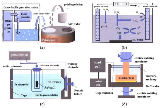 - Deng, J.; Lu, J.; Yan, Q.; Pan, J. Enhancement mechanism of chemical mechanical polishing for single-crystal 6H-SiC based on Electro-Fenton reaction. Diam. Relat. Mater. 2021, 111, 108147. [Google Scholar] [CrossRef]