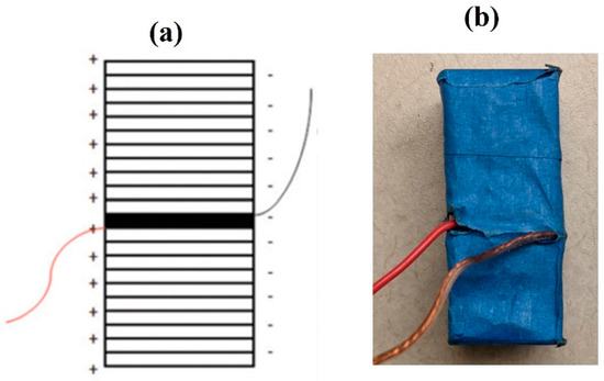 The stacked PZT transducer is custom fabricated from thin plates of PZT-5H-based soft PZT materials. The advantage of using PZT-5H is that it is easily polarized compared to PZT-8, which is a hard PZT material. Figure 2a shows the design of the assembled stacked PZT transducer. The transducer consisted of 21 active plates and one insulating plate. Each PZT plate was of a length and width of 20 mm and a thickness of 2 mm. To ease the alignment issues during fabrication, the stacks were first built in separate 10 and 11 plates and then combined. Indium was chosen as the electrode bonding between the plates and is connected in a way that forms parallel connections between the plates. The final fabricated stacked PZT transducer is shown in Figure 2b, with the dimensions h = 50 mm and l = w = 20 mm [8].