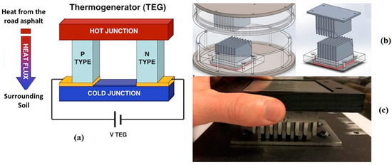 Thermoelectric generators (TEG) are solid-state semiconductor devices that convert a temperature difference and heat flow into a useful DC power source. Thermoelectric generator semiconductor devices utilize the Seebeck effect to generate voltage. This generated voltage drives electrical current and produces useful power at a load. The Seebeck effect is the generation of electricity between a thermocouple when the ends are subjected to the temperature difference between them. A combination of four thermoelectric generators is used in the research. Bismuth telluride (Bi2Te3) TEGs were selected due to the high figure of merit. The figure of merit is the number used to determine the efficiency of a TEG to convert a temperature difference into useful electrical energy. The figure of merit for different materials varies with temperature. Considering the system will be deployed in Texas, where maximum temperature difference occurs during summertime causing the asphalt temperature to reach 400 K, bismuth telluride TEGs have the highest figure of merit at this temperature. Figure 3a illustrates the Seebeck effect considering the temperature gradient between the asphalt and the surrounding soil. The heat flows from the asphalt to the soil underneath. Heat sinks are used between the top and bottom plates to carry the heat from the asphalt to the top metal junction of the TEGs. The bottom metal junction of the TEGs is at the same temperature as the soil underneath the asphalt. Figure 3b shows the COMSOL model of the heat sink concept as a module with the TEGs as well as isolated. Figure 3c shows the fabricated heat sink module along with TEGs inside. The heatsink design was validated by COMSOL simulation, and the model indicated the TEG was able to increase the temperature difference across the TEG from 0.1 °C to 1.1 °C [10]. The TEGs were tested with the module in direct sunlight. A total of 4 TEGs are divided into 2 groups, each comprising 2 TEGs connected in parallel are in series with the other group, making 4 TEGs in total. This combination is done to attain optimized voltage and current from the TEGs. The stacked PZT transducer has an energy conversion efficiency of 37% and each TEG has an efficiency of 11%.