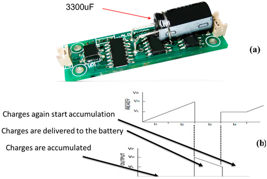 (a) EH301A energy harvester with 3300 uF storage capacitor. (b) Charging and discharging cycle of the EH301A energy harvester.