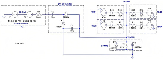 The voltage from the TEGs, which is 120 mV, is very low and needs to be boosted to the charging level of the battery. ELC-BVB120 boost convert is selected for the TEGs because its conversion efficiency was experimentally found to be 86% while converting 120 mV to about 4 V with a load. The objective was to have both AC-to-DC and DC-to-DC boost converters operate simultaneously, charging the rechargeable battery pack of NiCad batteries. The Pspice model for the combined converter design is shown in Figure 5. It was recorded that multi-sourcing energy is very possible by the carefully designed electronic module. Minimum energy sourced from harvesters that can be converted to collect energy cumulatively to charge a battery thus also proved to have high efficiency of the module. Four TEGs are connected to the DC-rail using the concept that was presented before. Current responses are equivalent to what one should expect from a TEG at the 10 V (open circuit) output of the boost converter. A low thermal variant, that is, a small temperature difference across the TEG plates, is considered in this simulation because the soil is an excellent thermal conductor and, hence, the temperature difference is assumed to be small between the asphalt on the road and the soil underneath. To make more rigorous verification of the design, TEGs were given some uneven internal impedance to create non-uniform current responses. All resistors are used in line with the energy source of devices to control current and make them equivalent to the actual test results obtained from the boost converters. Since boost converters were not incorporated into the schematic, equivalent circuits were designed in the schematic. All multi-sources at PZTs’ AC-rail and TEGs’ DC-rail are acting to charge the battery flawlessly. Continuously feeding current is possible by this technique, because a rechargeable battery is a very large capacitor in real life. The real-time tested power was observed to be more than expected, with an improvement of 30.27% in efficiency. Inductive and capacitive converter combinations might have produced better impedance responses, resulting in a higher current to charge the battery. Figure 6 shows the stacked PZT transducer, TEG heatsink modules, and the converters inside the mechanical enclosure called HiSEC (Hybrid Integrated Sensing and Energy Conversion) module.
