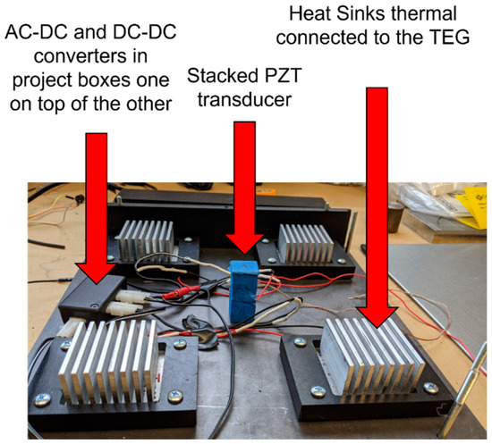 Hybrid Integrated Sensing and Energy Conversion (HiSEC) module with the stacked PZT transducer, heat sinks for the TEGs, and the converters.