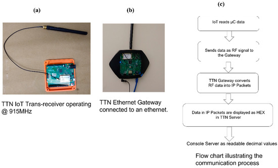 (a) TTN IoT transceiver. (b) TTN ethernet gateway. (c) Flow chart illustrating the communication steps.