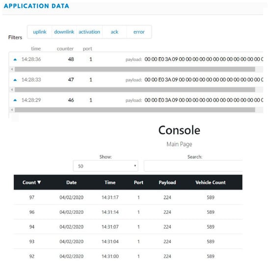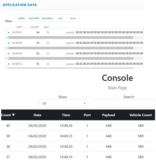 An MTS Acumen electrodynamic testing platform is used to test the system in a laboratory environment under various forces and frequencies (Figure 10). These forces are used to test the electrical power conversion from mechanical vibrations of the stacked PZT transducer. Real-time sensory data in hexadecimal forms and decimal forms were displayed on the TTN server and the console server, respectively. Power measurements from the stacked PZT transducer and the TEGs were also recorded under various forces and temperature differences. Several forces at different frequencies are used to test the HiSEC; also, temperatures were varied over a range to replicate the temperature gradient expected under roads in Texas. Two sensory parameters were recorded during the tests to prove the concept, vehicle weight, and axle count (represented as vehicle count). Figure 11 shows the real-time sensory data displayed on the TTN server and the console server when the MST Acumen ran with 1.5 KN of force at 10 Hz for 60 s. Similar data for 2 KN of force at 10 Hz for 60 s are shown in Figure 12. These equal 101.6 kg (224 lbs.) and 203.2 kg (448 lbs.) of forces at 10 Hz for 60 s, respectively.