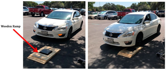 Similar testing of the system was also conducted on the roadways with successful results. A wooden ramp was used to drive cars over it while the HiSEC was in place on the ramp, as shown in Figure 13. The maximum communication range is over a distance of approximately 1.12 km in an urban environment. However, the range was expected (more than 1 mile) to be farther than achieved without an intermittent drop in the communication channel operating at 915 MHz. Path loss will represent the amount of energy lost in free space over a distance between the transmitter and the receiver. The farther away Tx is from Rx, the lower the energy is. Path loss is usually expressed as shown in Equation (2):