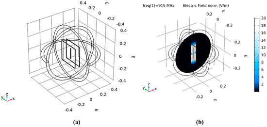 (a) COMSOL model of a dipole antenna between two metal plates. (b) COMSOL model simulation showing electric fields developing at the plates’ surfaces due to eddy currents.