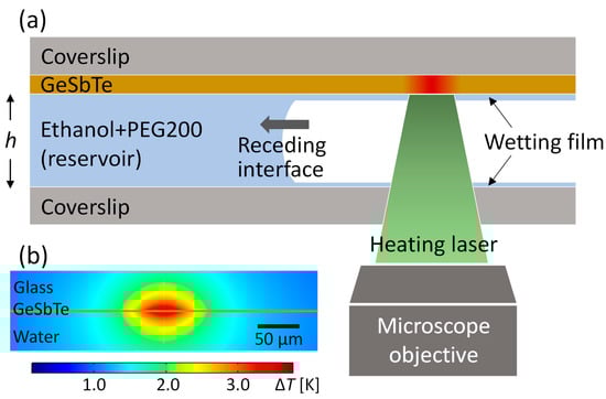In the present study, to achieve rapid growth and movement of a droplet, we propose the optical formation of a sessile droplet from a much thinner wetting film (<0.2 μm) of a binary mixture compared to those in the previous studies (~100 μm) [22,23,24], thus allowing to skip the aforementioned first step of droplet formation. The wetting film was formed by the recession of the mixture surface due to evaporation and was sustained by confining the mixture between two parallel plates with micrometer-scale separation. One of the plates was coated with a light-absorbing layer to enable the mixture to be heated without relying on doping. We achieved substantial improvements in the growth rate and transport speed of the droplet. More importantly, we demonstrated the sustainable formation of a droplet by bridging it between two parallel plates.