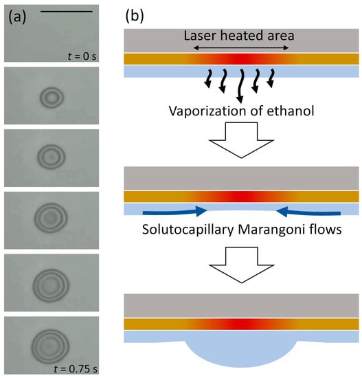 (a) Sequential snapshots of droplet formation process with a laser power of 0.48 mW. Snapshots were captured every 0.15 s. The scale bar is 50 μm. (b) Schematic of droplet formation in a wetting film of a binary mixed liquid under laser irradiation.