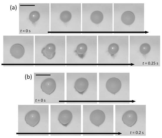 Sequential snapshots of the droplet deformation process by modulating the laser power with a mechanical chopper: (a) one modulation cycle at 4 Hz; (b) two modulation cycles at 10 Hz. The scale bar is 50 μm.