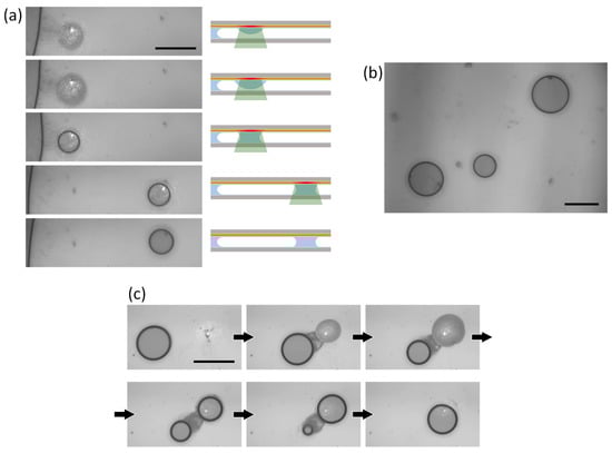 In our method, the droplet can be maintained only during the laser irradiation period. Ad hoc droplet formation is useful, for instance, for cargo capture and transport. However, sustaining droplet formation without the assistance of laser irradiation is also preferable for conducting chemical and biological assays, where multiple droplet manipulations and/or massively parallel analyses of nanoscale-to-microscale objects are needed for a microreactor array. In our setup, because the separation of the two coverslips is sufficiently small, the apex of a sessile droplet can touch the bottom wall, and the droplet can grow to bridge the top and bottom walls. Once the droplet bridge is formed, it can be sustained even after the removal of laser irradiation because of the hydrophilicity of the surface of the glass coverslip. Figure 5a shows a time sequence of the growth, bridging, and dragging process at a laser power of 4.0 mW (Video S5). In this demonstration, the two coverslips were separated by ~2 μm. Bridge formation is indicated by observing the disappearance of Newton’s rings. After the droplet bridge was dragged, the laser was turned off and the droplet bridge was confirmed to be sustained. The successive creation of multiple droplet bridges was also demonstrated, as shown in Figure 5b.