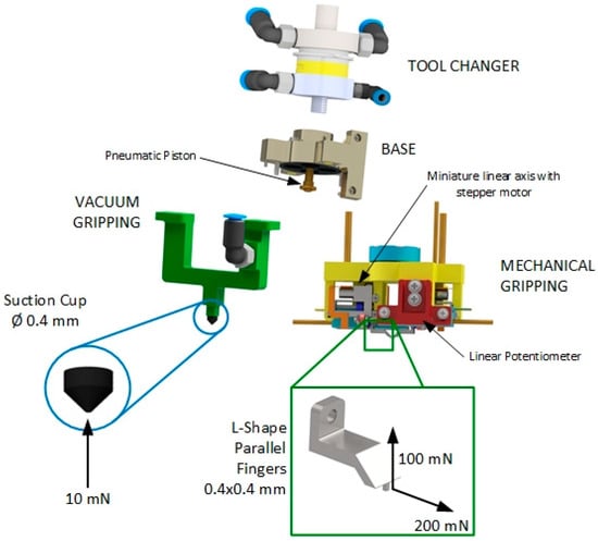 The designed hybrid micro-gripper consists of four sub-assemblies, as shown in Figure 2: the tool changer, the pneumatic cylinder, the vacuum gripper, and the mechanical gripper.