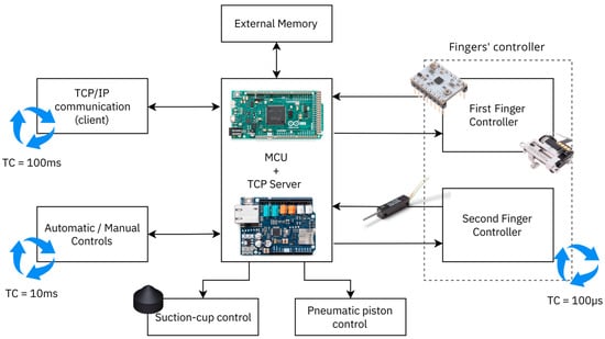 The controller was designed to control and manage all the micro-gripper functionalities, ensuring compliance with the project specifications reported in the previous section: open-loop control of the vertical lifting piston of the gripper fingers, on/off control of the suction vacuum, closed-loop position control of the two fingers independently, Ethernet TCP/IP communication for receiving commands and sending status messages, and external manual driving via the control panel or automatic one via digital signals. For this reason, the controller comprises several subsystems and components, as can be seen in the functional block scheme in Figure 7.