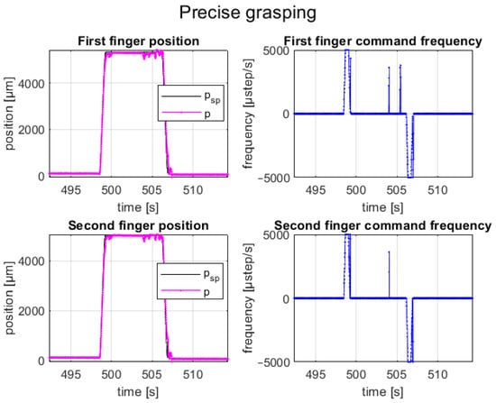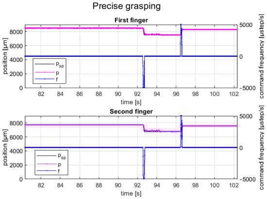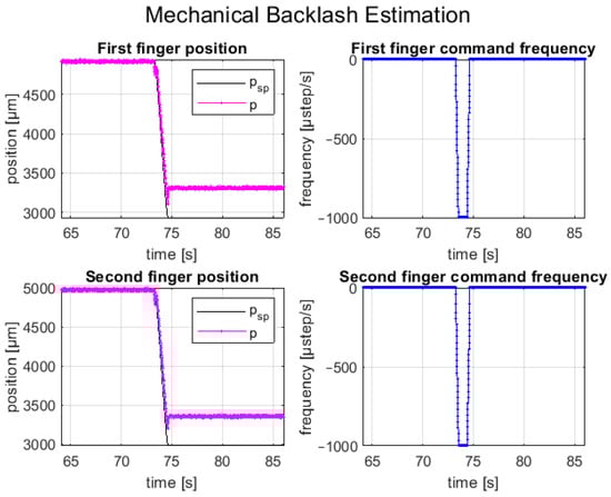 An experimental test was carried out to evaluate the mechanical backlash of the two linear axes of the fingers. The test for both axes involved several repetitions of a first initialization open-loop movement in one direction and a second open-loop movement in the opposite direction. This choice was made because the preliminary experiment showed that the mechanical backlash was more significant after changing the movement direction; therefore, it represented the worst condition. To avoid step loss due to the load torque, the tests were carried out by setting the maximum step frequency equal to 1 kHz, to assure a suitable motor torque. In this way, the steady-state error position of the tests was mainly caused by the mechanical backlash of the linear axis. Furthermore, a short displacement was commanded, in such a way that the error related to the theoretical step angle tolerance was reduced, and the main component of the steady-state error was the mechanical backlash. Figure 8 shows the setpoint position (psp), the feedback position (p), and the commanded step frequency of both fingers during a trial, consisting of an opening movement with a relative displacement of 2 mm and . It is worth noting that the feedback positions do not reach the theoretical positions due to the mechanical backlash of the linear axes.