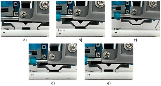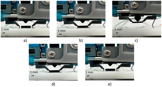 The hybrid operational mode is implemented, combining the two modalities described above. In particular, after Position 4 (Mechanical picking), Position 5 (Hybrid picking) consists of lifting the gripper pneumatic axis until the component is placed on the micro-suction cup. The 3-2 solenoid valve activates the vacuum, and the micro-suction cup grasps the component. Exploiting this hybrid operational mode, the component is grasped precisely and firmly. This position is shown in Figure 6c.