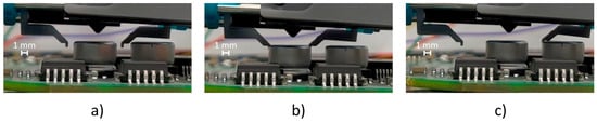 The picking and releasing test cycles with the stall detection option enabled: (a) initial position; (b) grasping position of the fingers; and (c) collision of a finger with the capacitor during the releasing phase.