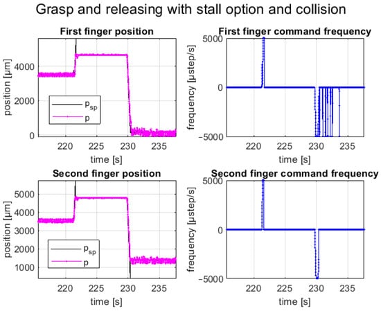 A total closure of the fingers was commanded to pick the component (i.e., electrolytic SMT capacitor with a size of 6 × 8 mm and a cylindrical shape); once the fingers collided with the component, they stopped and held the component in place due to the holding torque of the motor. The releasing phase was evaluated by simulating a collision of a finger with a component mounted on an electronic board during the full opening of the fingers. Once the finger collided with the obstacle, the controller recognized the stall and stopped both fingers in place. The picking and releasing cycles of the sample component with the stall detection option enabled are shown in Figure 16. The position tracking plots are shown in Figure 17. The represented trial consisted of a movement with a maximum step frequency of 5 kHz for both fingers in both directions, with . As explained before, a full close motion was commanded, resulting in a relative movement of 5.6 mm, as the starting position was not fully opened. Instead, for the releasing phase, a movement of the full stroke of 9.1 mm was commanded. It is worth noting, that when the stall occurred, the setpoint position (black line) increased until the stall threshold was reached, and then, the setpoint was fixed to the current position and the law of motion was stopped.