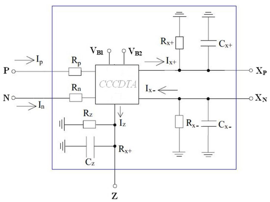 CCCDTA characteristics show similarities to conventional CDTA. In addition, the input parasitic resistances of CCCDTA can be easily adjustable with input bias current. CCCDTA has five terminals, two terminals of which are inputs, and the others are outputs. The input terminals have low impedance. The functional matrix of the CCCDTA is given in Equation (1). It is important to note that an active block of CCCDTA consists of the current difference unit and a transconductance block. In the first part, the input current signal is obtained and sent to the second stage as a voltage signal using a Current Differencing Unit (CDU). This enables the input terminal’s current difference to be obtained at the Z terminal. The second part of the CCCDTA incorporates a Dual-Output Operational Transconductance Amplifier (DO-OTA).