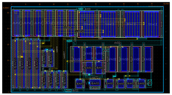 The presented structure has been fully implemented in the Cadence Virtuoso environment using TSMC 0.18 µm CMOS technology under ±0.9 V symmetrical power supplies. All simulations are given on the basis of extracted postlayout simulations as well. The memristor emulator illustrated in Figure 1 is examined through extensive analyses, where NMOS bulk terminals are connected to the most negative voltage and the PMOS devices’ bulks are shorted to the most positive voltage. Figure 4 gives the overall circuit’s layout to evaluate postlayout performance (the total area is around 26.5 µm × 53.9 µm).