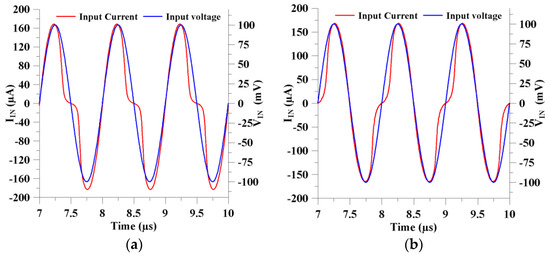 The memristor’s current and voltage signals are investigated with respect to the time axis in Figure 5a,b for incremental and decremental features, respectively. When the injected input voltage equals zero, the memristor current becomes zero as well. The change in the operation modes of the proposed memristor emulator can be seen from Figure 6a, where the input signal injection is applied to the P and N input terminals, respectively. In addition, the memristor has frequency-dependent characteristics so that it behaves as a combination of nonlinear and linear resistive characterization. When applied to high frequencies, it shows linear resistance behavior, while it shows nonlinear resistance behavior at low frequencies. As shown in Figure 6b, the memristor shows nonlinear voltage–current behavior at lower frequencies. However, it becomes more linear-resistant when the input signal frequency increases.