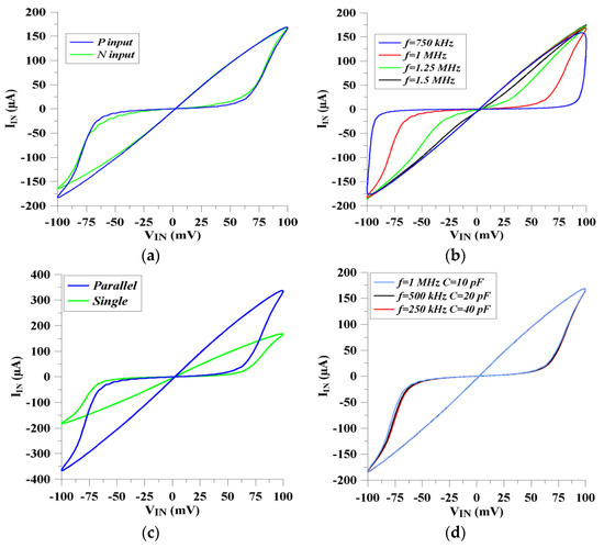 Furthermore, the parallel memristors should have more conductive features in comparison with single memristors. This is because memristors have resistive behaviors. Also, the voltage–current relationship of the parallel memristive devices becomes more nonlinear compared with the single memristive block. Therefore, hysteresis loops are justified and obtained, as shown in Figure 6c. Figure 6d shows an examination of the effect of the capacitor that is employed in the proposed memristor emulator. According to Equations (17) and (18), the voltage–current behaviors should be similar when the multiplication of operating frequency and capacitor value are the same. In Figure 6d, 0.25 MHz, 0.5 MHz, and 1 MHz frequencies are injected into the emulator circuit. Similar hysteresis loops are obtained for the capacitor values of 40 pF, 20 pF and 10 pF, respectively, with 100 mV of input signal amplitude.