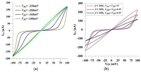 In Figure 7a, the memristor shows more linear behaviors when the control voltage of VB2 shifts to more negative voltages. As a result, the memristor circuit’s working frequency can be adjusted electronically by altering the VB2 voltage. Also, the VSS voltage value influences the memristor performance. Equations (14) and (15) clearly state that VSS directly affects the average memductance value, namely the time-invariant part of the memductance can be controlled by changing the VSS voltage. As shown in Figure 7b, the absolute value of the current increases as the VSS decreases.