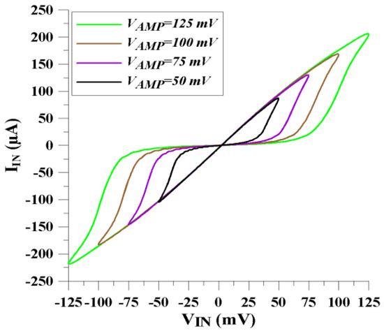 The time-variant part of the proposed memristor emulator structure is dependent on the amplitude value of the input voltage signal, as shown in Figure 8. This behavior confirms the theoretical structure of the emulator as given Equations (17) and (18).