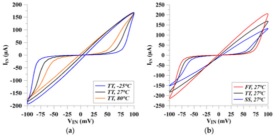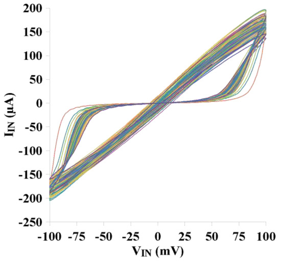 To verify the performance of the memristor emulator, pinched hysteresis loops are given for various process corners and a wide range of temperatures. As depicted in Figure 9a, slightly changed voltage–current hysteresis loops can be obtained for the wide range of temperatures (−25 °C to 80 °C). From Figure 9a, it is evident that the memristor current increases as the temperature level goes down. Regarding the different process corners, Figure 9b clearly indicates that the memristor emulator circuit still remains within the acceptable region to work in the specified operation mode. Meanwhile, to deepen the analysis of mismatches between the transistors and process corners on the proposed memristor emulator, the Monte Carlo analysis is presented in Figure 10. The Monte Carlo realization is given for a hundred times. The pinched hysteresis loop for the memristor circuit is shifted slightly. The performance of the proposed memristor remains within the acceptable limits.