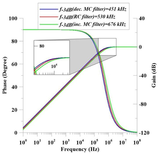 As shown in Figure 12 and Equations (19)–(23), the incremental and decremental configurations have different cut-off frequencies in the first-order high-pass filter application, where Cfilter is selected as 50 pF. In the incremental mode, the cut-off frequency is 676 kHz, while the decremental mode brings the cut-off frequency to around 450 kHz. In addition, the memristance value can be evaluated as 4.6 kΩ in the incremental configuration, while this value is around 7 kΩ in the operation of the decremental mode. This variation results from changing part of the memristance value in Equation (23) with regard to different operation modes.