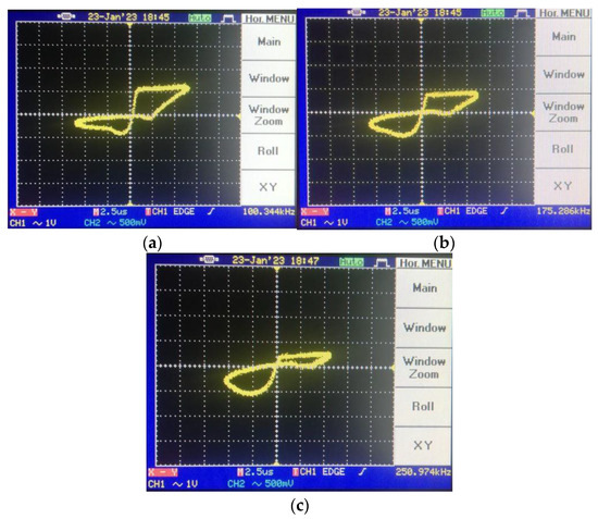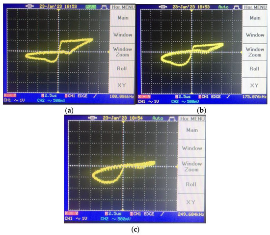 Pinched-loop hysteresis measurement for different frequencies in decremental mode: (a) @100 kHz hysteresis, (b) @175 kHz hysteresis and (c) @250 kHz hysteresis.