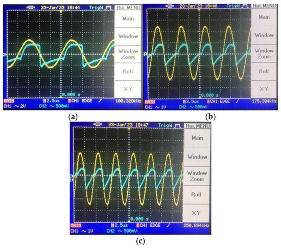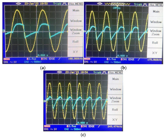 Transient responses for different frequencies in decremental mode: (a) @100 kHz transient, (b) @175 kHz transient and (c) @250 kHz transient (in the transient response, the yellow color output is input voltage, whereas the blue color one illustrates the load resistance’s voltage).