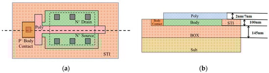 Layout of T-gate transistor of PDSOI used in our study (a) top view, (b) sectional view.