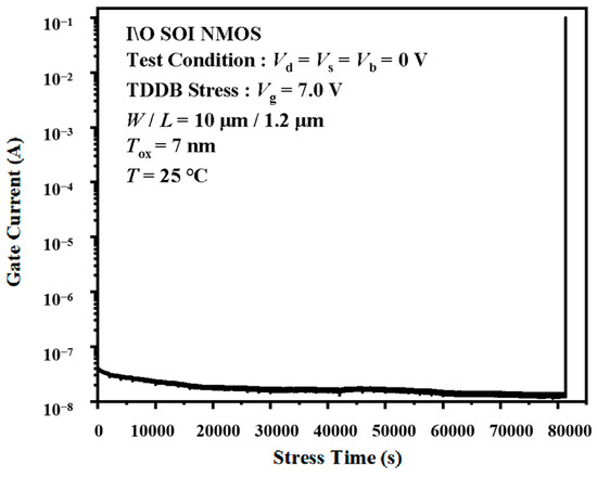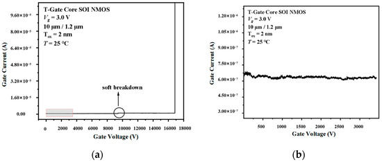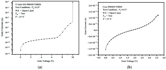 The TDDB acceleration stress was conducted by an Agilent B1500A semiconductor parameter analyzer (Canada, Americas) [17]. In the TDDB acceleration stress experiment, we needed to apply high stress to the sample for a long time. Therefore, we used constant voltage stress (CVS) [18,19,20,21] on the devices to monitor the changes in parameters and used a custom test box to connect the B1500A’s cable to the devices to guarantee the stability of the test. This test selected 15 samples manufactured in the same batch consisting of the same components to test the I/O devices and Core devices on different samples. Before the experiment, we needed to test the initial characteristics and the gate intrinsic breakdown voltage of the device. The initial characteristics can be used to confirm that the device is functioning properly, while the gate intrinsic breakdown voltage can be used to determine the applied voltage for TDDB acceleration stress experiments. Therefore, we first used two sets of samples as pre-tests, and we used the slope method to measure the initial breakdown characteristic curve of the device. The initial breakdown characteristic is shown in Figure 2. The results show that the breakdown voltage of the I/O device with a working voltage of 3.3 V is 8.5 V, and the breakdown voltage of the Core MOS device with a working voltage of 1.2 V is 3.7 V. The gate of the device was at a higher voltage than the normal operating voltage. We used 80% of the intrinsic breakdown voltage as the stress voltage. Therefore, the gate stress voltage of the I/O device is 7.0 V and that of the Core device is 3.0 V. The source, drain, and substrate contact were connected to 0 V (grounded). The TDDB acceleration stress was applied to the device until oxide breakdown was observed. During the TDDB test, the parameters were measured at intervals so that we could obtain the degradation of the parameter during the stress. By using the B1500A semiconductor tester, we were able to obtain the electrical parameters of the device automatically. The following device curves and parameters were measured to monitor device degradation under stress, such as the transfer characteristic curve, output characteristic curve, threshold voltage, and transconductance.