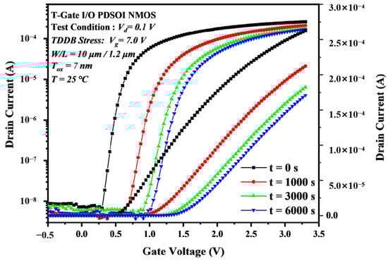 Figure 3 shows the transfer characteristic curve of I/O devices under accelerated stress at 7.0 V TDDB at 25 °C. It can be observed that under the action of TDDB acceleration stress, the overall transmission characteristic curve of the device shows a positive deviation trend. Among them, the speed is faster in the first 1000 s, and as the stress time continues to increase, the amplitude of the curve change gradually decreases, ultimately reaching saturation. To further understand the influence of the TDDB’s effect on device electrical parameters, a quantitative analysis of parameter curves was conducted. In Figure 3, the drain current at Vg = 3.3 V decreases from 260 μA to 200 μA in the first 1000 s, while it decreases from 170 μA to 157 μA in the last 3000 s. Figure 4 shows the degradation of the transfer characteristics of the Core device under the TDDB acceleration stress. Compared to the transfer characteristic curves of the I/O device, the curves of the Core device show much less variation even when the equivalent oxide electric field is higher than the former. The difference value of Id between t = 0 s and t = 7500 s in the Core device is below the nanoampere level.