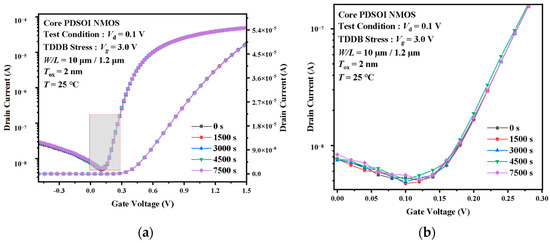 Degradation of the transfer characteristic curves of the Core devices under the TDDB stress. (a) Complete, (b) partially enlarged.