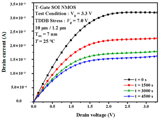 Usually, we consider the TDDB process to be divided into two phases based on previous studies [22,23,24]. The first phase of the TDDB process is the defect accumulation phase, in which the trap charge continues to accumulate in the oxide layer as the stress time increases. The second phase is the breakdown phase. When the trap charge’s density accumulated in the first phase reaches a critical value, a complete conductive path will be formed in the MOSFET device’s gate oxide [25]. This results in the breakdown of the oxide layer. In this experiment, we will focus on the first phase of TDDB breakdown. Based on the breakdown theory described above, traps that accumulate in the gate oxide of a MOSFET must affect its performance. Therefore, the I-V characteristic and the critical parameters of the device are used to characterize the performance degradation of the device.