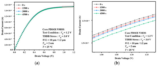 Degradation of the output characteristic curves of the Core devices under the TDDB stress. (a) Complete, (b) partially enlarged.