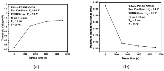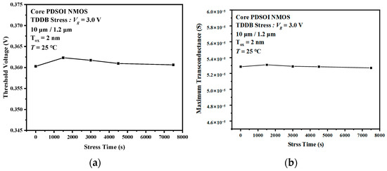 The transistor threshold voltage is the gate voltage at which the device begins to switch on. Moreover, the transconductance is a manifestation of the ability of the gate voltage to control the drain current. These two parameters are critical parameters of MOSFET and can reflect the gate oxide quality and performance of MOSFET. Figure 7 shows the threshold voltage and maximum transconductance degradation of an I/O device under the TDDB stress. It can be observed that both the threshold voltage and the transconductance of the I/O device are significantly affected by the stress. In particular, at early times, the threshold voltage shifts from 539 mV, corresponding to t = 0 s to 1020 mV, corresponding to t = 1500 s. Like the transfer characteristic curves of I/O devices, the amount of variation in the threshold voltage also decreases with stress time. The maximum transconductance of the I/O device is shifted negatively, with the same trend as the threshold voltage. Since the transconductance and threshold voltage are closely related to the oxide trap density, it can be inferred that the TDDB acceleration stress leads to an increase in the oxide trap density. However, the two parameters of the MOSFET are almost unchanged under the stress in the Core device shown in Figure 8.