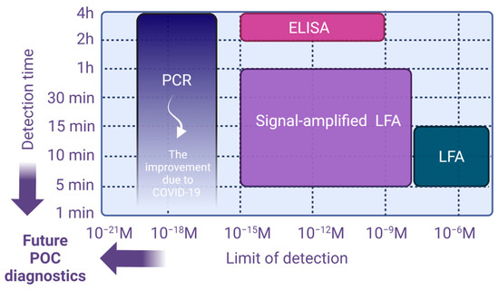 Comparison of the detection limit and detection time for various POC techniques. Improvement in PCR as a “COVID-19 accelerator effect”.