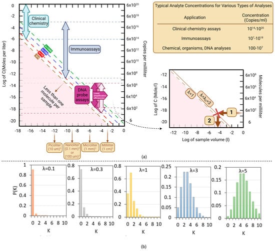 Scaling of concentrations and sample volumes; (a) typical chemical and biological concentrations available for a few kinds of analysis. In general sample quantities in the picoliter to nanoliter range are sufficient for assaying the biological molecules involved in clinical chemistry assays (between 1014 and 1020 copies/mL) and immunoassays (between 107 and 1018 copies/mL). A minimum of 100 µL is required for accurate DNA assays (from 107 copies/mL to less than 100 copies/mL). (b) The probability that a given partition contains exactly k molecules for different values of λ.