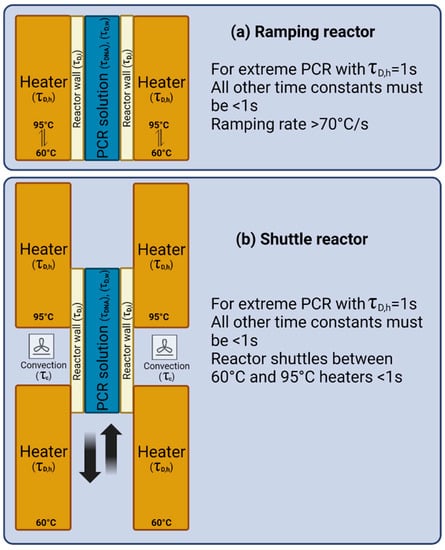 Two typical PCR reactor configurations. (a) A ramping PCR system, where the temperature of both heaters on both sides of the reactor is ramped from 60 to 95 °C. (b) A shuttling PCR, where the reactor is shuttled from one temperature zone to another briefly exposing the reactor walls to air in between. τDNA is a time associated with the slowest reaction step in the amplification of DNA. τc is the time constant for the convection of air over the PCR reactor, is the heat diffusion time for water, is the heat diffusion time for the insulating reactor wall, and is the heat diffusion time for the heater.